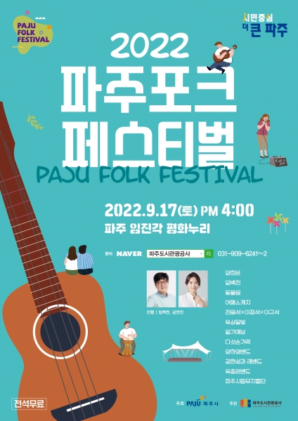 파주도시관광공사는 ‘더 큰 파주, 포크로 평화를 노래하다’를 주제로 오는 9월17일 오후 4시 임진각 평화누리 야외공연장에서 ‘2022 파주포크페스티벌’을 개최한다고 밝혔다.