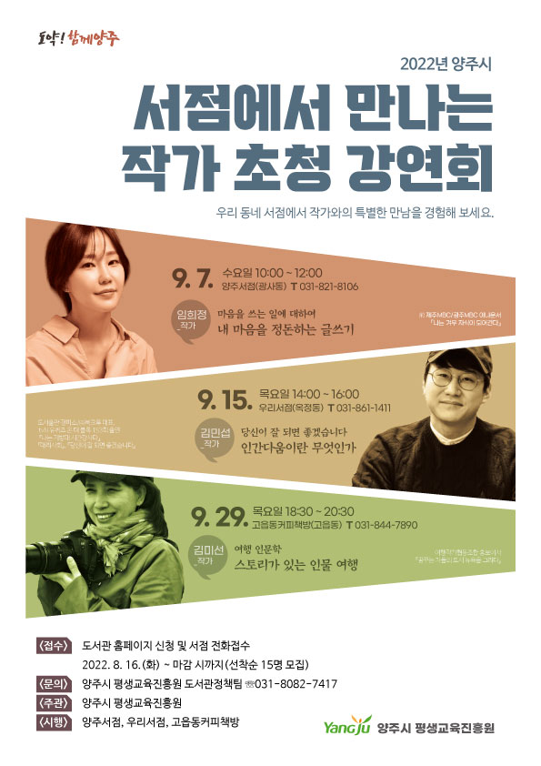 [금요저널] 양주시는 오는 9월 지역서점 3개소에서 총 3회에 걸쳐 작가와의 특별한 만남인 ‘2022년 양주시 서점에서 만나는 작가 초청 강연회’를 개최한다.