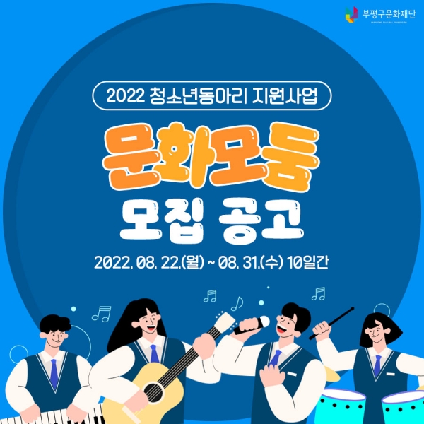[금요저널] 부평구문화재단이 오는 31일까지 청소년 동아리 대상 지원 사업 ‘문화모둠’ 공모를 진행한다.