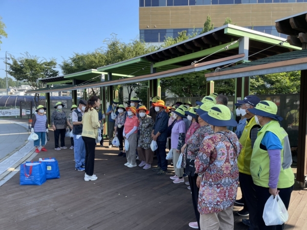 지난 17일 노인일자리 ‘거리환경개선 사업’ 참여자를 대상으로 생수, 부채, 마스크 등 물품을 지원하면서 어르신들의 건강과 안전을 당부했다.
