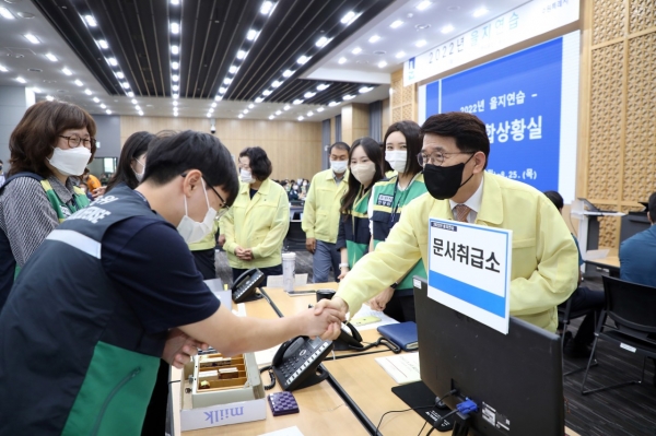 [금요저널] 수원특례시의회 김기정 의장과 이재식 부의장을 비롯한 의장단이 22일 수원시청 을지연습장을 방문해 2022 을지연습 훈련 상황을 참관하고 직원들의 노고를 격려했다. 김기정 의장은 “을지연습은 국가비상사태에 신속히 대응할 수 있도록 위기관리 능력을 키우고 국민의 생명과 안전을 보호하기 위한 훈련”이라며 “전쟁, 테러 등 각종 위기 상황에서 신속하고 정확하게 대응할 수 있도록 실전과 같은 훈련에 임해 달라”고 당부했다.
