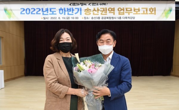 [금요저널] 의정부시 송산3동은 8월 19일 오후 4시, 송산3동 공공복합청사 5층 다목적강당에서 국회의원, 의정부시의회 의장, 시의원 등 내빈들과 송산권역 자생단체장 및 회원, 일반 주민들이 함께한 가운데, 하반기 송산권역 업무보고회를 개최했다.