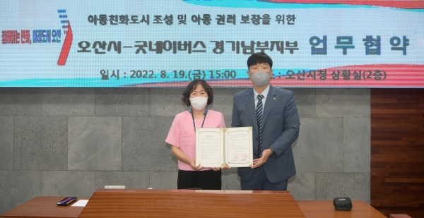[금요저널] 오산시와 굿네이버스 경기남부지부가 아동친화도시 조성에 대한 상호협력 체계 구축하는 업무협약을 지난 19일에 체결했다.