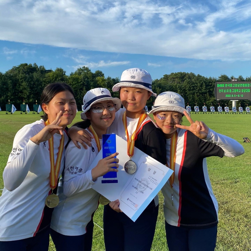 예천여자중학교(교장 김종만)는 지난 8일부터 9일까지 진호국제양궁장에서 열린 ‘제48회 문화체육관광부장관기 양궁대회’에서 여중부 개인전 60m에서 은메달을 차지했고, 뒤이어 열린 10일부터 12일까지 경기인‘제49회 한국중고연맹양궁대회’에서 단체전 은메달을 획득하였다.