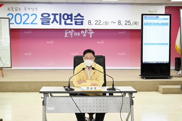 [금요저널] 강수현 양주시장은 22일 시청 대회의실에 마련된 전시종합상황실에서 열린 ‘2022년 을지연습 상황보고회’에 참석해 을지연습 훈련에 따른 최초 상황보고를 받았다.
