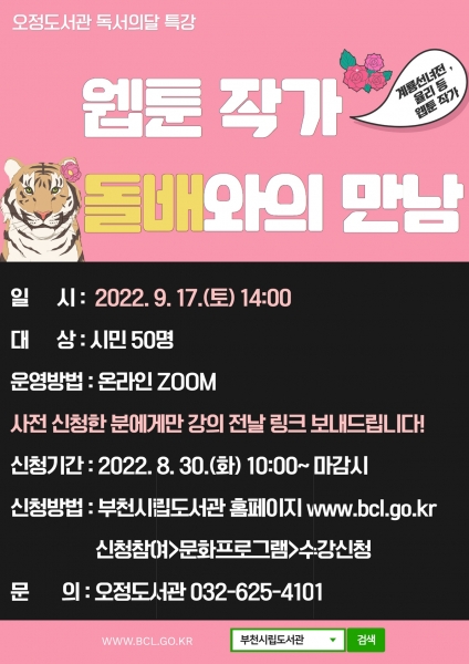 [금요저널] 부천시립오정도서관은 독서의 달을 맞이해 오는 9월 17일 웹툰 작가 ‘돌배’와의 만남 행사를 운영한다.