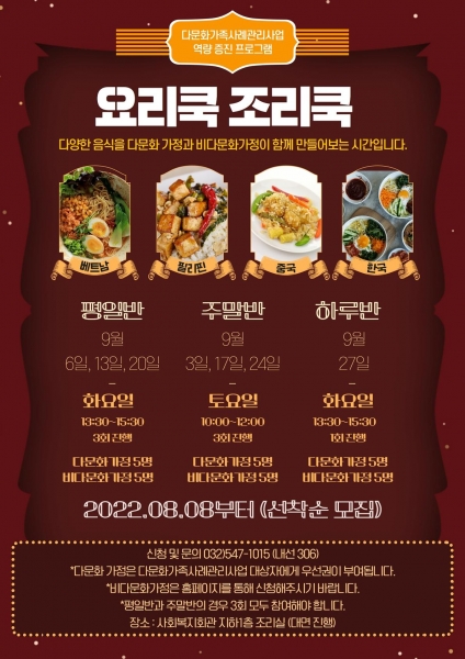 [금요저널] 인천광역시 계양구가족센터는 다문화 가정과 비다문화가정이 함께하는 요리교실인 ‘요리쿡 조리쿡’을 운영한다고 23일 밝혔다.