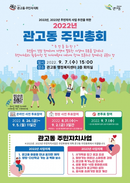 2022년 관고동 주민총회는 9월 7일 오후 3시 관고동 행정복지센터 2층 회의실에서 개최된다.