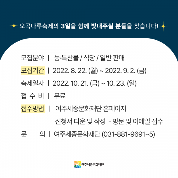 여주세종문화재단은 오는 10월 21일부터 23일까지 3일간 신륵사 관광지 일원에서 '2022 여주오곡나루축제'를 개최한다.