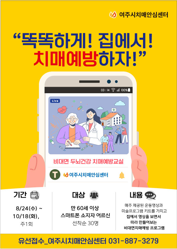 [금요저널] 여주시보건소 치매안심센터는 코로나 재확산 위험을 대비해 내소 중심에서 디지털 활용 기반으로 한 집에서도 할 수 있는 ‘비대면 두뇌건강 치매예방교실’을 8월 24일부터 10월 18일까지 8주간 치매예방교실을 진행한다고 밝혔다.