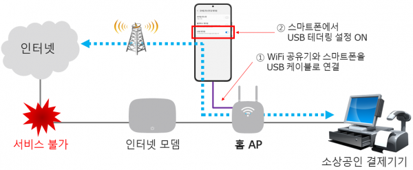 유선 인터넷 장애 상황에서 결제불가로 인한 소상공인 피해가 발생할 경우에 대비해, 유선3사는 휴대폰 테더링 기능을 이용한 결제기기의 긴급결제가 가능하도록 지원한다.