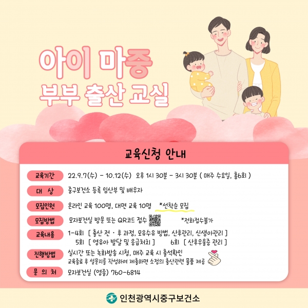 [금요저널] 인천 중구는 건강한 임신·출산·양육에 필요한 교육을 예비부모에게 제공함으로써 정서적, 신체적 준비를 통해 자신감을 증진시키고 부부의 적극적인 참여를 유도하고자 ‘아이마중 부부 출산준비교실’을 운영한다.