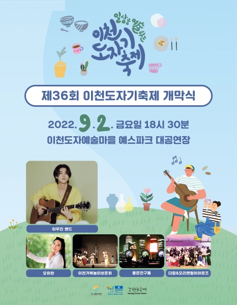 올해로 36회째를 맞는 이천도자기축제는 9월 2일부터 10월 3일까지 이천도자예술마을 예스파크에서 주말과 공휴일 14일 동안 집중적으로 운영하고 방역지침을 준수하며 방문객들을 맞이한다.