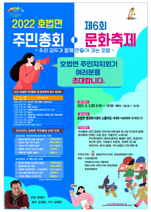호법면민들의 화합과 소통의 장이 될 ‘호법면 주민총회 및 제6회 문화축제’는 오는 9월 3일 호법면행정복지센터 소통마당에서 개최되며 분과별 사업의제 발표, 주민참여공연, 노래자랑 및 경품추첨 등 다양한 행사가 진행될 예정이다.