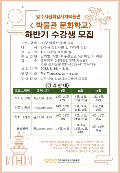 양주시회암사지박물관,‘2022 박물관 문화학교’하반기 수강생 모집