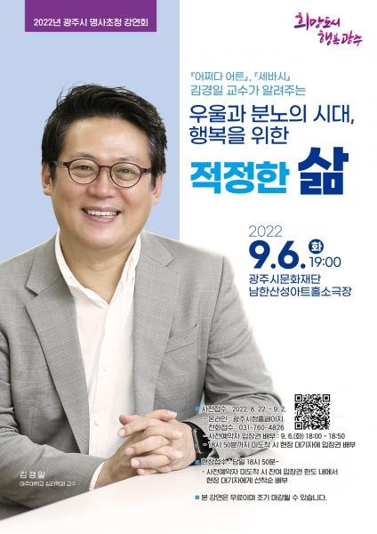 김경일 교수는 tnN 어쩌다 어른, CBS TV 세상을 바꾸는 시간-15분 등에 출연해 심리학, 인간관계 등과 관련된 주제로 강연해 왔으며 이번 명사초청강연회를 통해 광주시민에게 좀 더 행복해질 수 있는 삶의 방향을 제시해 줄 것으로 기대된다.