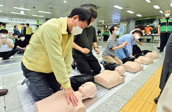 차준택 구청장과 부평구 직장민방위대원은 심폐소생술과 자동심장충격기 사용방법, 화생방용 방독면 착용방법 등 적 공습상황을 가정한 민방공 대피훈련과 생활안전교육을 직접 체험했다.