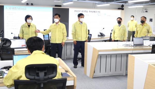 [금요저널] 염종현 경기도의회 의장이 25일 경기도 전시종합상황실을 방문해 ‘2022년 을지연습’에 참여한 공직자를 격려했다.