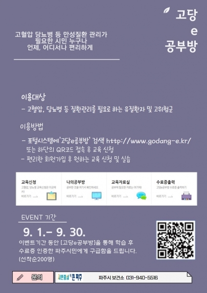 ‘고당e공부방’이란 고혈압·당뇨병에 대해 환자 스스로 질환 관리를 학습할 수 있는 온라인 교육시스템으로 시간과 장소에 관계없이 모바일과 PC를 통해 이용할 수 있다.