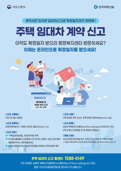 주택임대차 신고대상은 2021년 6월 1일 이후 체결된 보증금 6천만원 또는 월차임 30만원을 초과하는 주택임대차 계약으로 임대차계약 체결일로부터 30일 이내 임차주택 소재지 관할 행정복지센터를 방문하거나 부동산거래관리시스템을 통해 온라인으로 신고하면 된다.