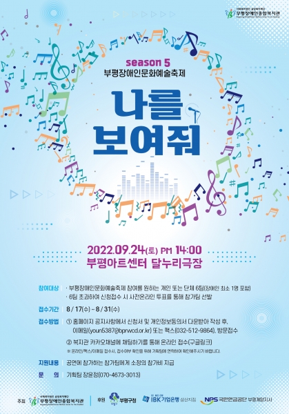 [금요저널] 부평구부평장애인종합복지관이 오는 31일까지 2022 장애인문화예술축제 ‘나를 보여줘’ 시즌5의 공연 참가자를 모집한다.