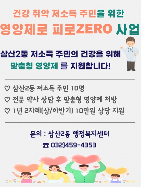 [금요저널] 부평구삼산2동이 오는 9월부터 저소득 가정 10곳에 맞춤형 영양제를 지원하는 ‘영양제로 피로ZERO사업’을 진행한다.