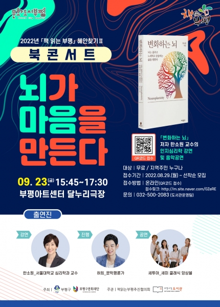 9월 23일 부평아트센터 달누리극장에서 진행하는 이번 북콘서트는 ‘변화하는 뇌’의 저자 한소원 서울대학교 심리학과 교수와 문학평론가 허희가 인지심리학을 주제로 대면 진행한다.