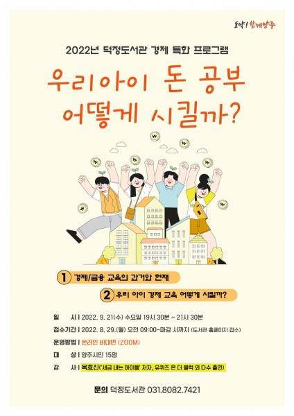 [금요저널] 양주시 덕정도서관은 오는 9월 21일 오후 7시 30분에 경제 특화 프로그램‘우리아이 돈 공부 어떻게 시킬까?’수강생 15명을 선착순으로 모집한다.
