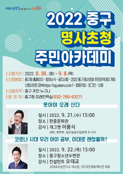 [금요저널] 인천 중구는 위드 코로나 시대에 축소된 문화콘텐츠를 회복하고 다양한 명사 강연을 통해 구민에게 심신 힐링의 시간을 제공해 구민 소통의 장을 마련하고자 ‘2022 중구 명사초청 주민아카데미’를 오는 9월 21일 22일 연이어 개최한다.