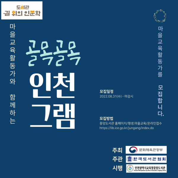 [금요저널] 인천광역시교육청중앙도서관은 문화체육관광부가 주최하고 한국도서관협회가 주관하는 2022년 도서관 길 위의 인문학 공모사업 ‘골목골목 인천그램’을 운영한다.
