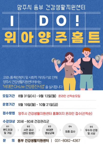 [금요저널] 양주시 건강생활지원센터는 오는 31일부터 9월 12일까지‘I DO 위아 양주 홈트’1기 참가자 50명을 선착순으로 모집한다.