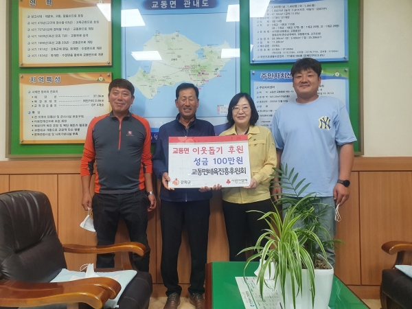 이번 성금은 8월 30일 개최 예정이었던 교동면민의 날 기념 체육대회가 코로나19로 감염병 예방을 위해 취소된 아쉬움을 달래고 소외된 이웃들에게 도움이 되기 바라는 체육진흥후원회 위원들이 뜻을 모아 마련했다.
