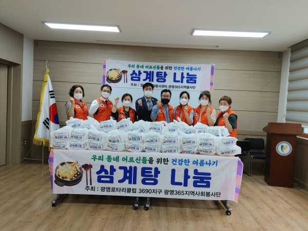 박지은 광명로타리클럽 365지역봉사단 회장은 “사랑으로 준비한 삼계탕을 드시고 막바지 여름 더위를 건강하게 이겨내시고 다가오는 추석 명절도 즐겁게 보내시길 기원한다”고 말했다.