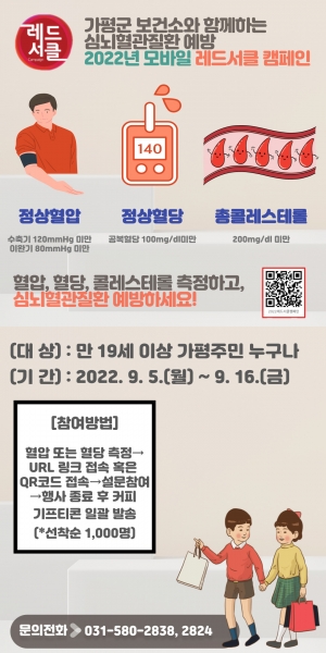 [금요저널] 가평군 보건소에서는 심뇌혈관질환 예방관리주간을 맞아 9. 5. ~ 9. 16.까지 모바일 레드서클 캠페인을 실시한다.