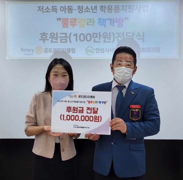 박동훈 공도로타리클럽 회장은 “교육 지원에 동참할 수 있어 매우 기쁘다 미래 주역인 아이들이 건강하고 밝게 자랄 수 있도록 나눔 활동을 지속적으로 해 나가겠다”고 말했다.