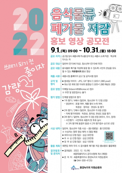 [금요저널] 세종특별자치시가 1일부터 시민을 대상으로 ‘2022년 음식물류 폐기물 저감 홍보영상 공모전’을 실시한다.