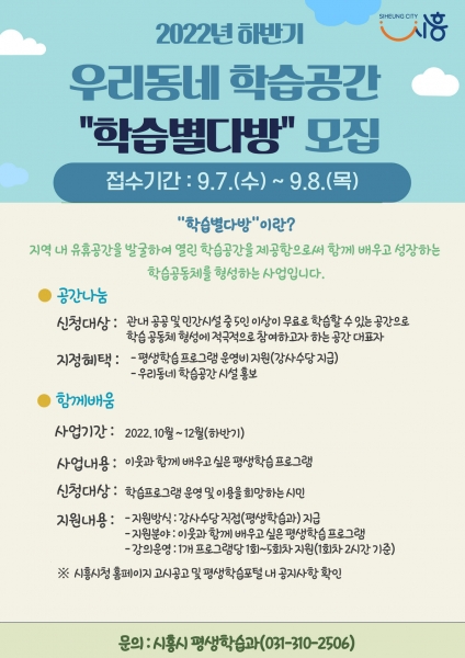 시 관계자는 “누구에게나 열려있는 학습공간에서 이웃과 함께 배움의 즐거움을 느끼며 개인의 역량을 지속적으로 발전시켜 나갈 수 있는 기회”며 “누구나 배움을 누릴 수 있는 교육도시 시흥 기반 조성을 위해 적극적인 관심과 참여를 바란다”고 밝혔다.