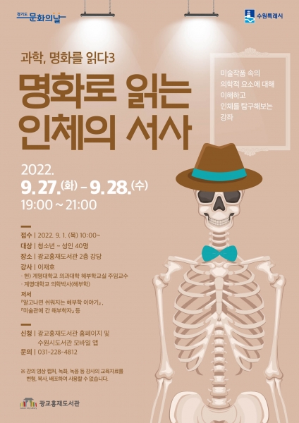 [금요저널] 수원시 광교홍재도서관이 ‘과학, 명화를 읽다 3: 명화로 읽는 인체의 서사’ 수강생 40명을 9월 1일 오전 10시부터 모집한다.