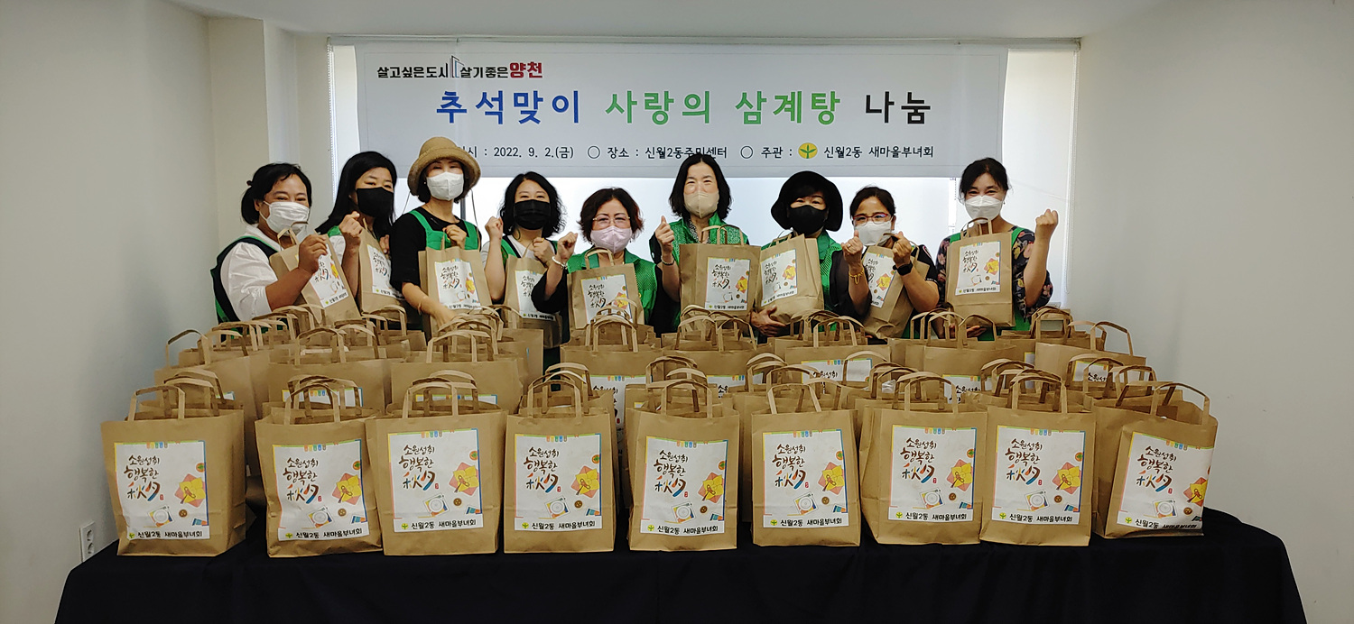 같은 날 신월2동(동장 조숙현)에서는 신월2동새마을부녀회가 취약계층 70가구에 ‘추석맞이 사랑의 삼계탕 꾸러미’를 전달했다. 이번 행사는 부녀회원들과 주민봉사자들이 삼계탕, 떡, 과일이 담긴 꾸러미를 직접 포장해 방역수칙을 준수하며 각 가정에 배송했다.