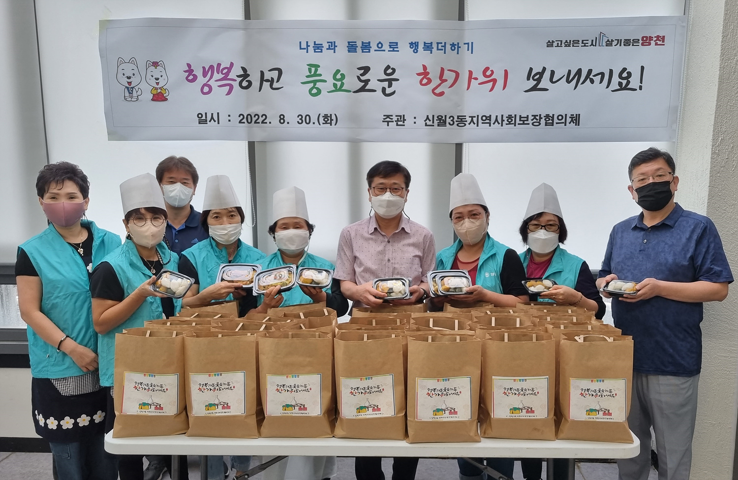신월3동(동장 안기주)에서도 지난 30일 신월3동지역사회보장협의체(이하 ‘협의체’)가 주관하는 손맛 담긴 명절음식 나눔행사 ‘우리라서 더 행복한 한가We’가 열렸다. 협의체 위원들은 고독사 위기 40가구에 정성스레 조리한 모둠전, 송편, 불고기 등으로 꾸려진 한가위 꾸러미에 희망까지 담아 각 가정에 전달했다.