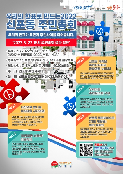 올해 처음 열리는 신포동 주민총회는 주민자치회에서 최근 재확산되고 있는 코로나19 추이를 감안해 비대면으로 열기로 결정했으며 9월 5일부터 21일까지 투표를 진행한 후 오는 9월 27일 주민총회 결과를 온라인으로 게시할 예정이다.