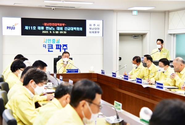 [금요저널] 김경일 파주시장은 제11호 태풍 ‘힌남노’가 5~6일 한반도에 영향을 줄 것으로 예상됨에 따라 모든 공식 일정을 취소하고 5일 아침 재난안전대책상황실에서 국소본부장, 관련 부서장 및 읍면동장이 참석한 가운데 긴급대책회의를 가졌다.