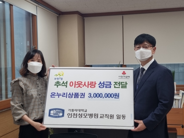 [금요저널] 부평구부평3동은 지난 5일 가톨릭대학교 인천성모병원으로부터 교직원들이 정성껏 모은 추석 이웃사랑 성금 300만원을 전달받았다.