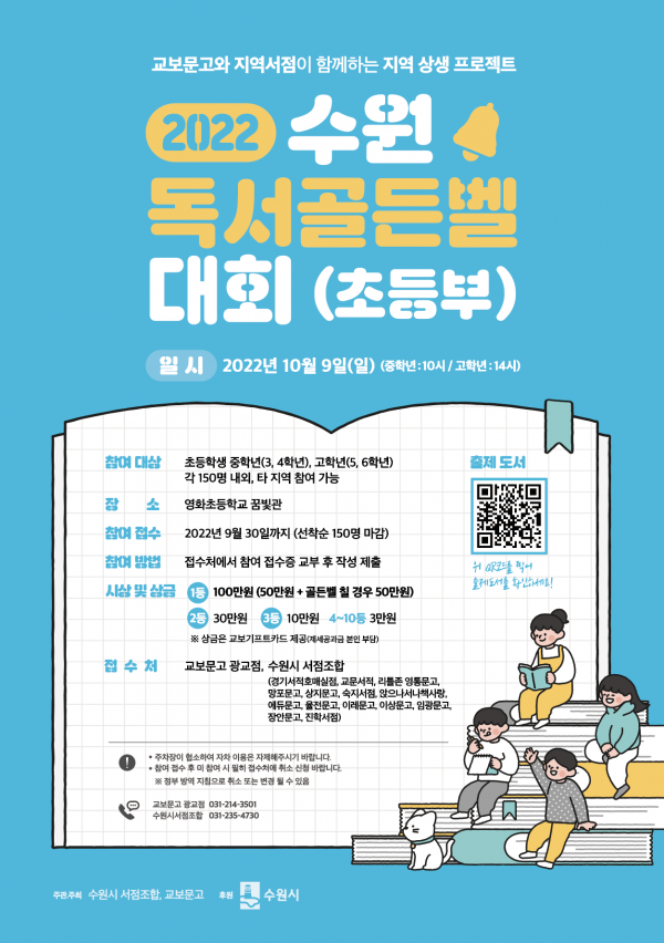수원시 서점 조합과 교보문고 광교점이 공동 주최하고 수원시가 후원하는 ‘2022 수원 독서골든벨’은 10월 9일 영화초등학교 꿈빛관에서 열린다.