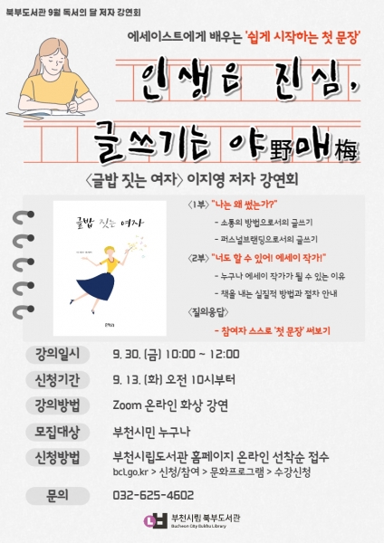 [금요저널] 부천시 북부도서관에서 9월 독서의 달을 맞아 ‘글밥 짓는 여자’의 저자 이지영 작가를 초청해 ‘쉽게 쓰는 에세이 첫 문장’이라는 주제로 9월 30일 저자 특강을 개최한다.