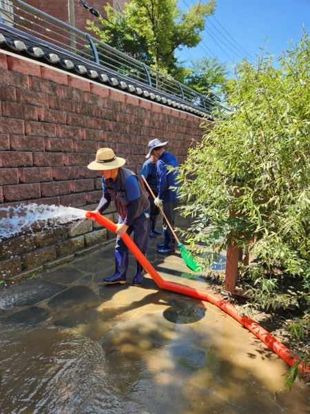 이에 시는 하천 내 둔치산책로에 가득 차 있던 빗물이 빠져나간 7일부터 둔치 시설물과 산책로 구간에 퇴적된 부유물 및 토사를 제거하고 각종 시설물을 복구하는 등의 정비를 실시했다.