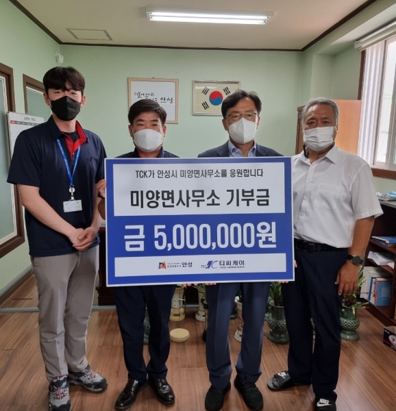 [금요저널] 안성시 미양면은 지난 6일 미양면 소재 기업 ㈜TCK의 관계자들이 면사무소를 방문해 어려운 이웃에게 전해달라며 추석맞이 이웃돕기 성금 500만원을 기탁했다고 밝혔다.