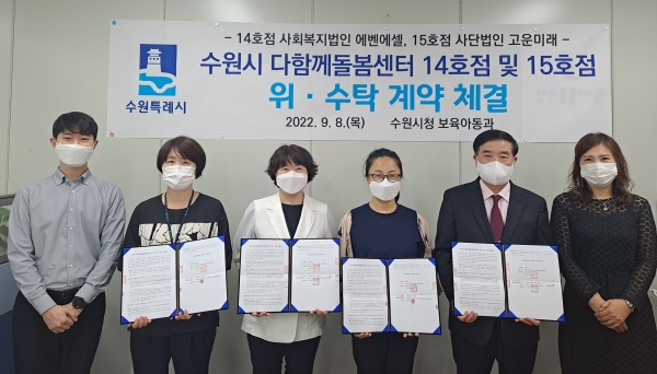 수원시는 8일 수원시청에서 사회복지법인 에벤에셀(14호점), 사단법인 고운미래(15호점)와 위·수탁 계약을 체결했다. 위·수탁 기간은 10월 1일부터 2027년 9월까지 5년이다.