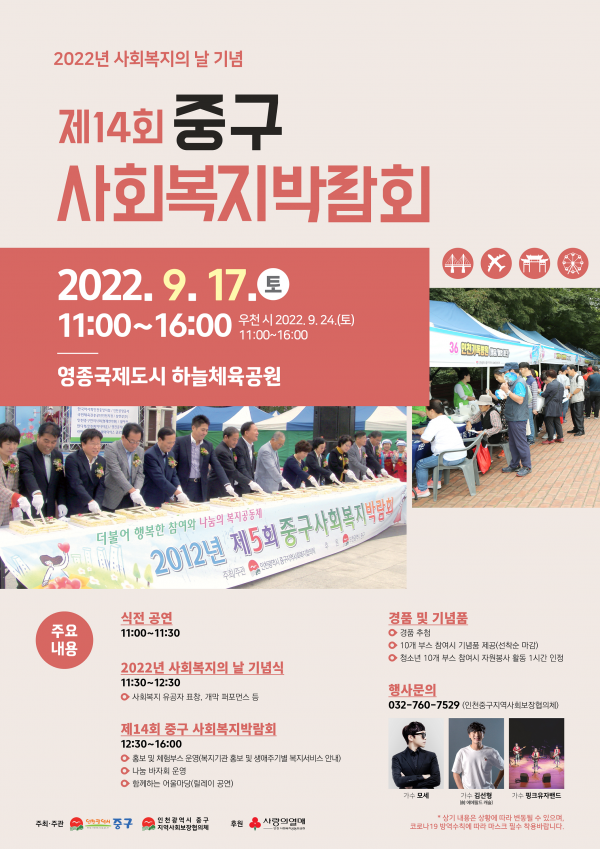 [금요저널] 인천 중구는 오는 17일 영종국제도시 하늘체육공원에서 중구 지역사회보장협의체 주관으로 지역 주민들과 함께 즐길 수 있는 ‘제14회 중구 사회복지박람회’를 개최한다.