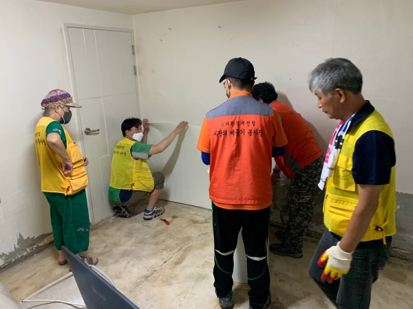 이번 봉사활동에는 물먹은 장판·벽지 제거를 통해 충분히 건조하는 작업과 전문기술을 가진 집수리봉사단의 벽지 도배, 장판 시공 작업으로 나뉘어 진행된다.